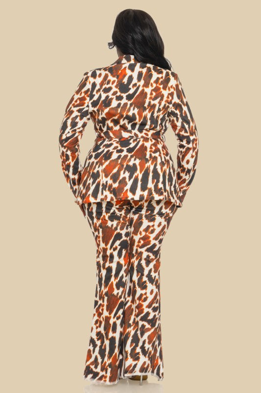- Coordinated Suit Set - Animal Print Denim Material - Fabulous Flair - Stretch Fabric - Tailored Blazer - Shoulder Pads - Adjustable Waist Tie - Matching High Waisted Pants - Front Button & Zipper Closure - Chic & Sultry 95% Cotton, 5% Spandex