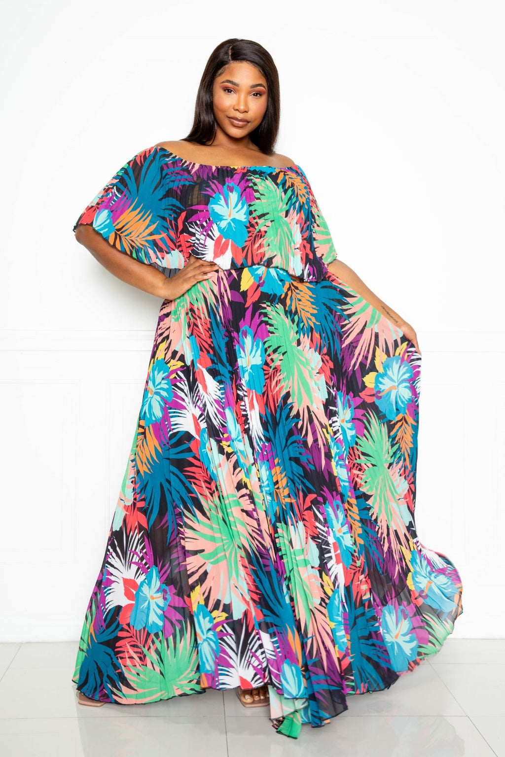 TROPICAL PRINTED OFF SHOULDER PLEATED MAXI DRESS