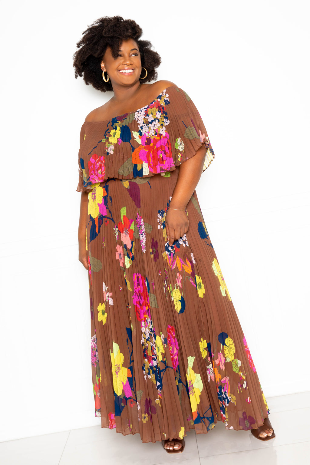 FLOWER OFF SHOULDER PLEATED MAXI DRESS