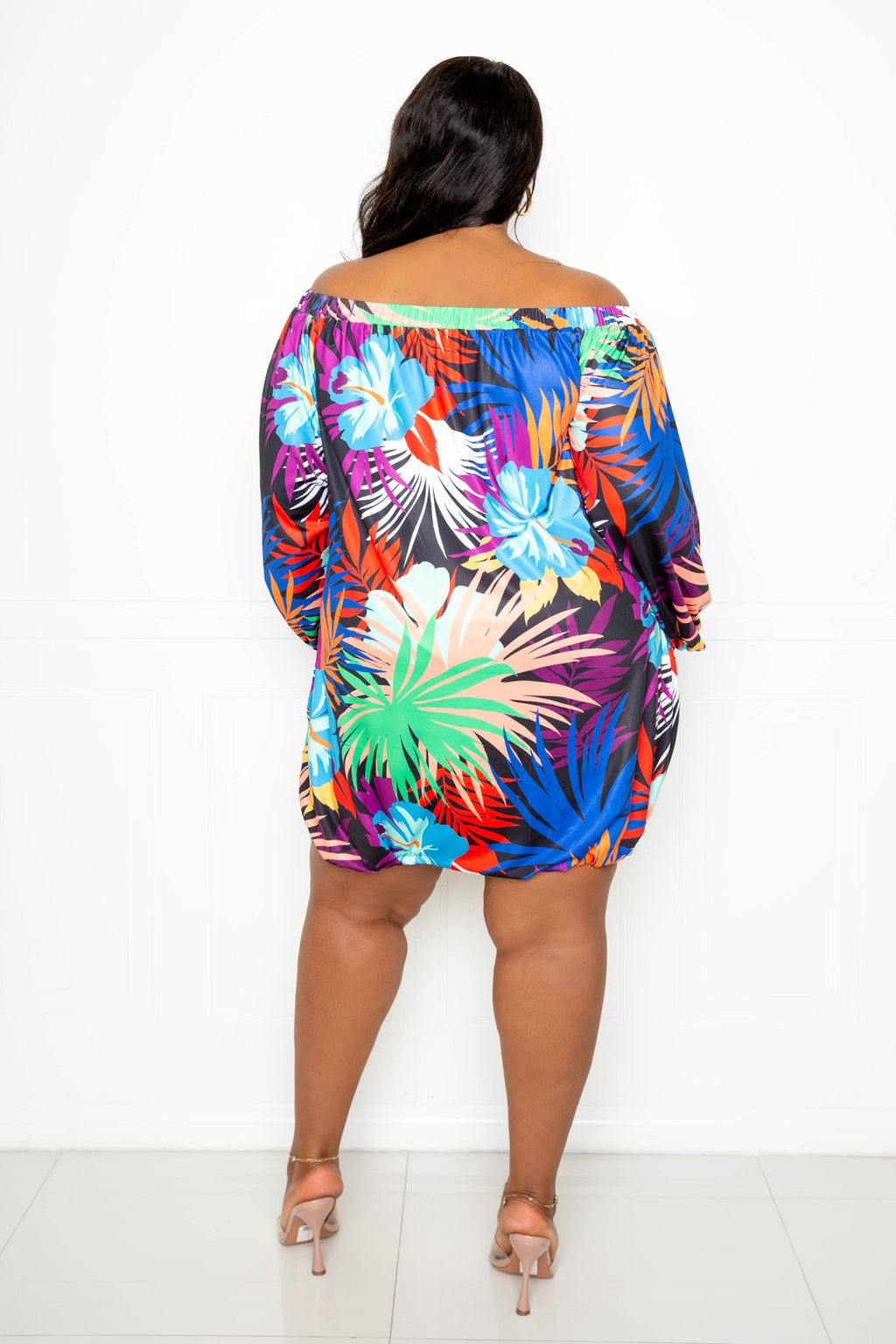 TROPICAL OFF SHOULDER BUBBLE MINI DRESS