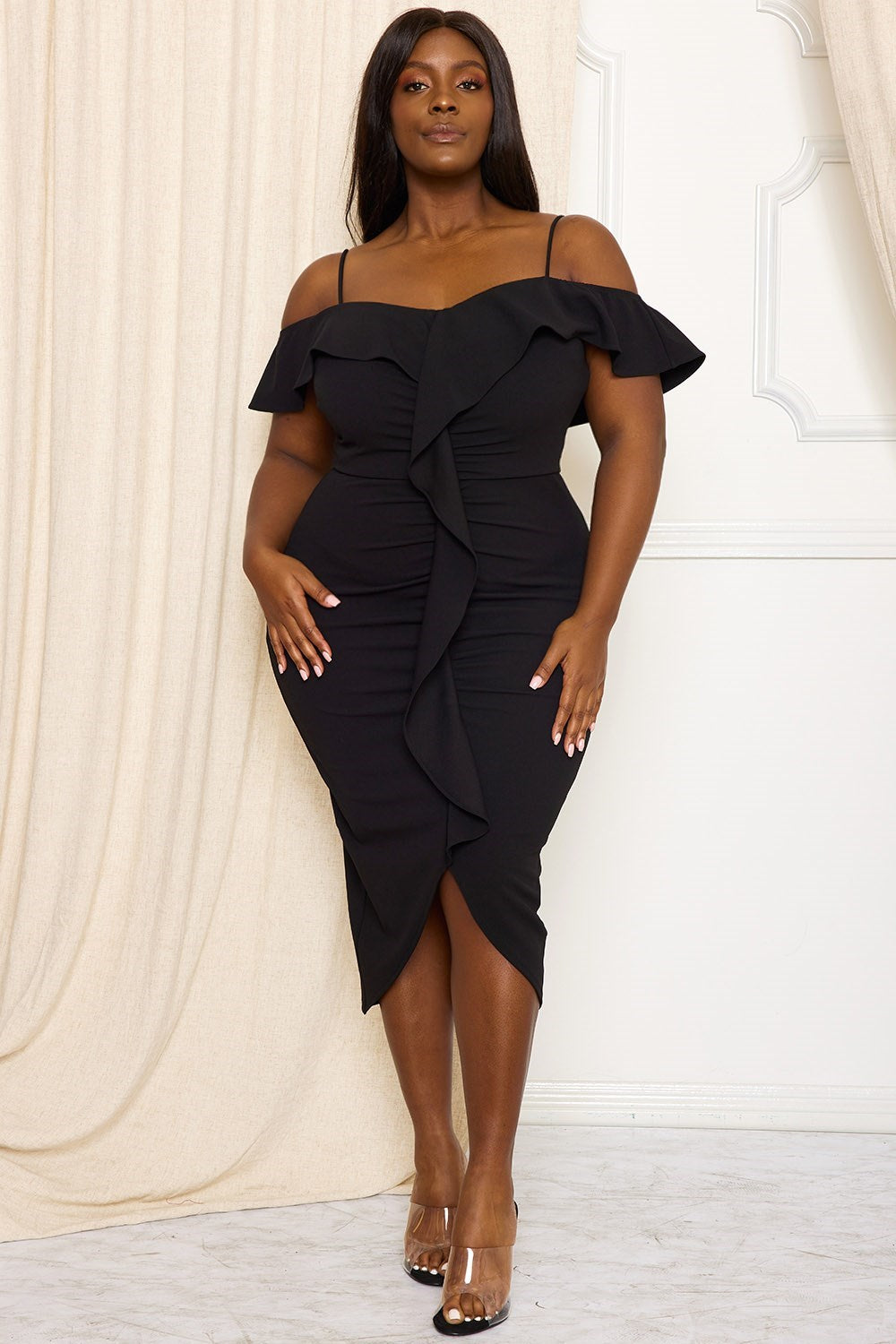 OPEN SHOULDER WITH RUFFLE LAYER PLUS SIZE MIDI DRESS