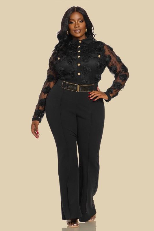 - Feminine Chic Jumpsuit - Flattering Fit - Floral Lace Top - Decorative Pockets - Button Accents - Collared V-Neckline - Wide Leg - Back Zipper SELF: 95% Polyester, 5% Spandex LINING: 100% Polyester CONTRAST: 100% Polyester