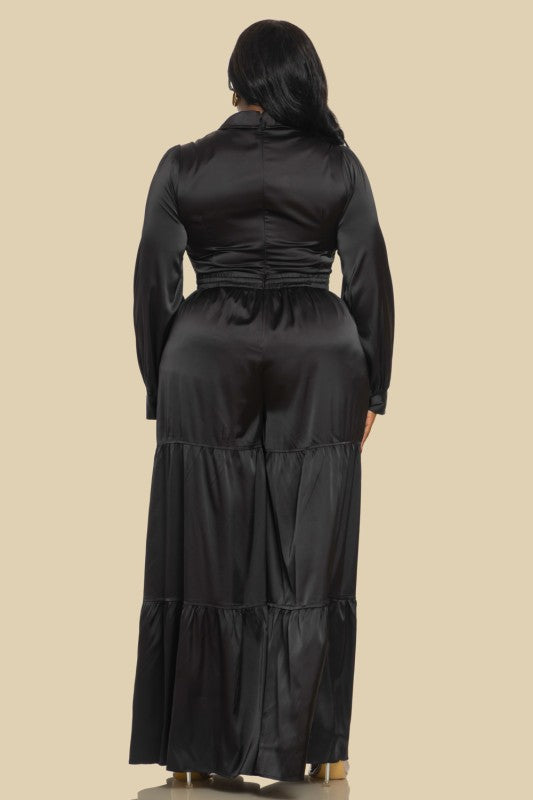 - Casual Chic Jumpsuit - Silky Satin Material - Flattering Fit - Collared V-Neckline - Twist Front Detail - Drawstring Waist - Tiered Wide Leg - Functional Pockets - Long Sleeves 97% Polyester, 3% Spandex